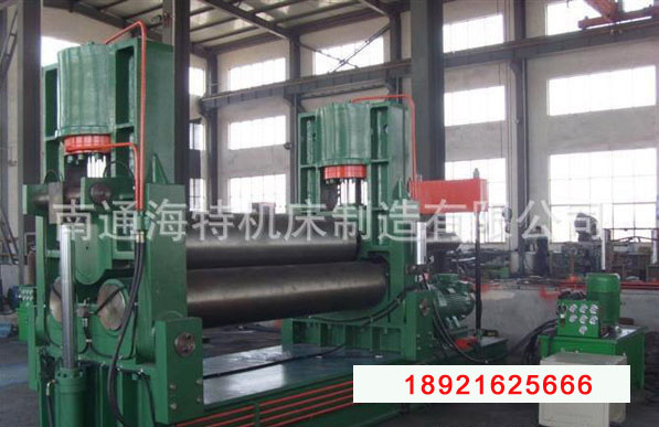 The structure of the machine is a three roll symmetrical type. The upper roll moves vertically up and down at a symmetrical position in the center of the two lower rolls, which is obtained by the hydraulic oil in the hydraulic cylinder acting on the piston. It is a hydraulic transmission. The two lower rolls rotate, and the output gear of the reducer meshes with the lower roll gear to provide torque for the rolled sheet.